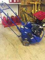 There are no belts to the cutting wheel. The hydraulic direct drive eliminates the need for expensive drive belts. A brake on the cutting wheel makes for safer operation. The unit will easily fit through 36" gates. The open and accessible body style allows for easy service and maintenance. A low center of gravity helps the stability of the unit on uneven terrain.